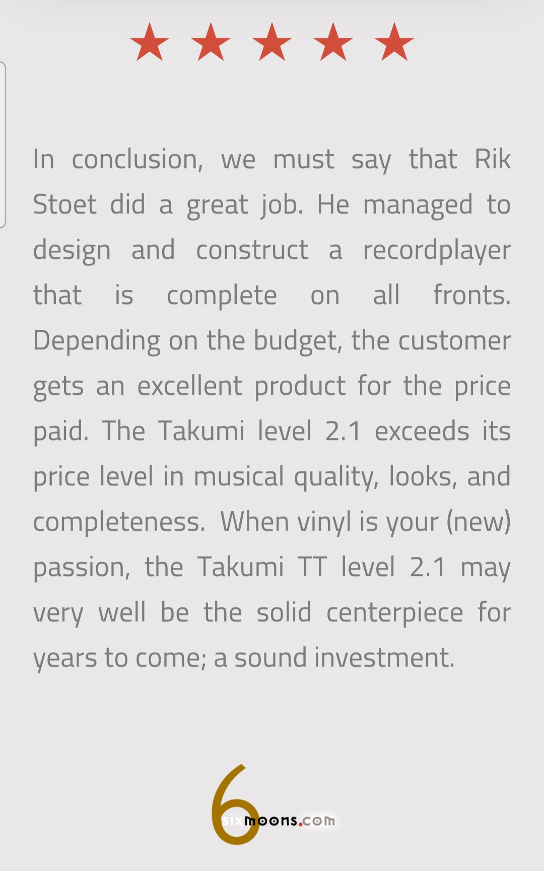 The Takumi level 2.1DC isn’t just about looks or trends. It’s built on solid engineering and refined through careful listening. Every part is chosen to serve one purpose: to deliver clear, natural sound from your records — with no distractions.