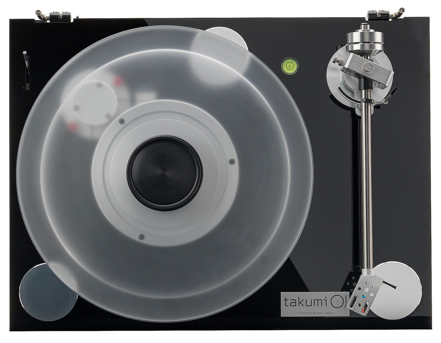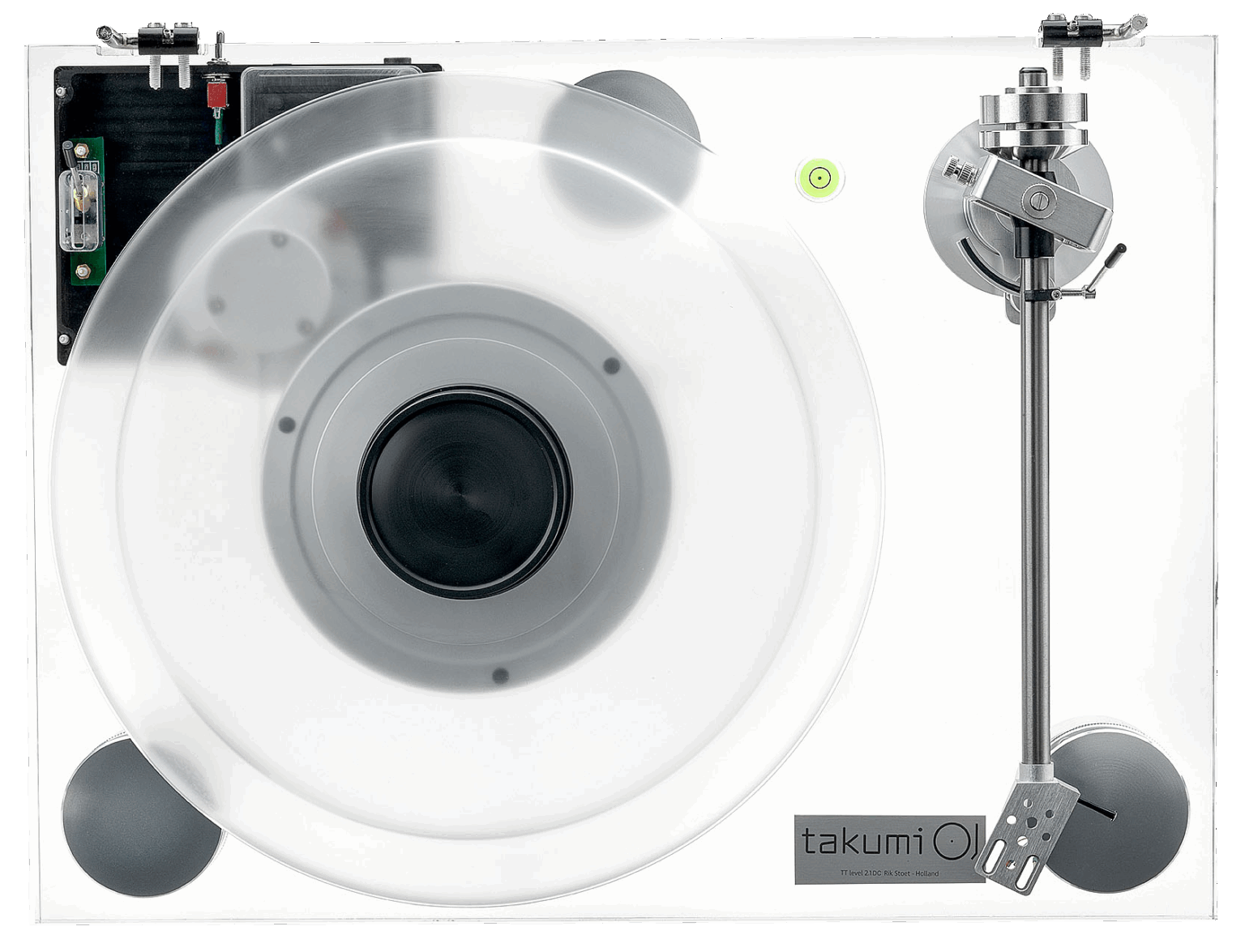 Setting up a turntable can sometimes be time-consuming, especially when trying to get the chassis perfectly level. To simplify this, the Takumi level 2.1DC includes a precision bubble level built directly into the acrylic base. There’s no need for external tools or guesswork. You can simply adjust the three feet while watching the built-in level, and the turntable will be properly aligned in just a few minutes.