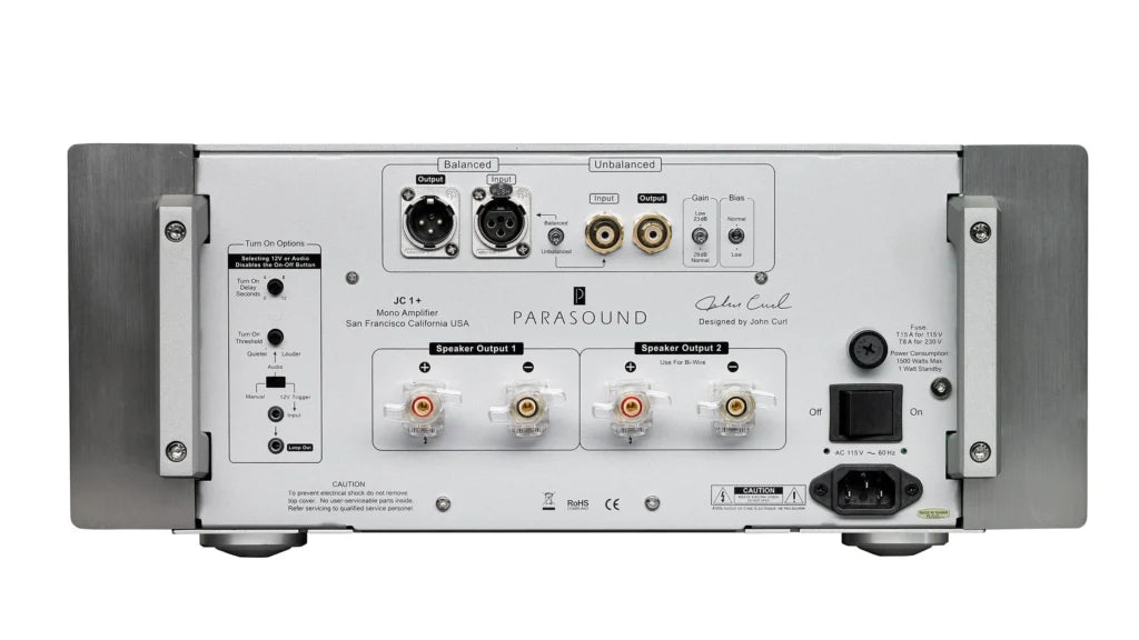The Parasound JC1+ delivers monoblock performance on a majestic scale—450 W into 8 Ω, over 1,300 W into 2 Ω, and up to 25 W in pure Class A. Whether it’s the intimate tones of solo piano or the thunder of orchestral crescendos, the JC1+ delivers every detail with uncanny control, space, and realism. Built on John Curl’s decades-long halo legacy, this amp raises the bar with rugged R-core power supply design, system tuning switches, and precision-grade audio components. Its transparent performance and refined execution make it ideal for high-resolution systems, audiophile-level home theaters, and demanding speaker pairings alike. 400 -> 450 Watts @ 8Ω, 800 -> 850 Watts @ 4Ω, 1200 -> 1300 Watts @ 2Ω, Filter capacitance: 132,000 -> 198,000 uF, Transformer capacity: 1.9 -> 2.1kVA, Output transistors: 18 -> 24 Sanken 60Mz devices. Peak current: 135 -> 180 amps, Weight: 64 -> 83 lbs net, Bybee Music Rails™ active high frequency noise filters, John Curl driver stage employs a new cascode circuit design, FR-408 input circuit board material improves HF signal integrity, Gain switch to select 29 dB or 23 dB gain, R-core power transformer for input stage, Input circuit board is shielded, Double thickness copper on output/power supply circuit boards, Gold-plated internal audio signal path connectors, Custom CHK Infinium speaker binding posts, Looping Neutrik XLR output for easier bi-amping, Front panel power indicator LED, Updated auto turn on circuit with5mm 12V trigger jacks. Circuitry designed by legendary John Curl Ultra-high bias Class A/AB operation, 25 watts of pure Class A power, Stable with speaker impedance dips below 1Ω, Bybee Music Rails™ -active high frequency filters for input stage, New John Curl driver stage employs a cascode circuit for greater open loop bandwidth & superior linearity, Gain switch to select 29 dB or 23 dB gain for optimum compatibility with high gain preamps or extremely efficient speakers, R-core transformer for input stage suppresses noise on power line, 6 massive 33,000 uF Nichicon Gold Tune filter capacitors for output stage, 22,400 uF input stage power supply filter capacitors, independent of the main power supply, Dual CHK Infinium, custom 5-way speaker binding posts for easy bi-wiring, Neutrik locking XLR balanced input & loop output jacks, Vampire 24k gold-plated RCA input & loop output jacks, Direct-coupled signal path, no capacitors or inductors in the audio path, JFET input stage, MOSFET driver stage, 24 beta-matched 15 ampere, 230V, 60 MHz bipolar output transistors, 2.1 kVA shielded toroid power transformer with premium H18 grade core, Independent power supplies for input stage, driver stage & output stage, Full power is rated all the way down to 2Hz for unrestricted low-end bass, Harris hyper-fast soft-recovery bridge diode rectifiers, REL & Nichicon Muse capacitors, DC servo & relay protection circuits, AC turn-on inrush surge protection with relay bypass, Automatic turn-on by 12 V trigger or audio sensing, 4 rack space chassis with rear carry handles, Rack mount hardware is included.