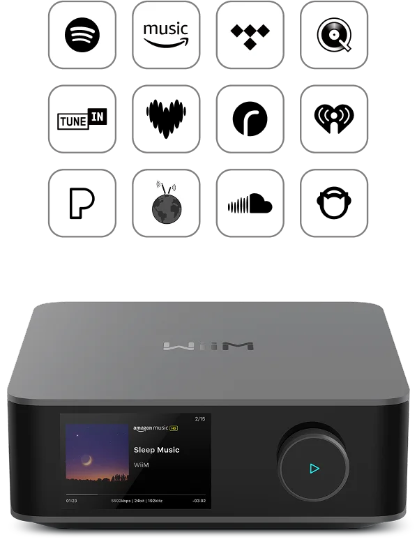 You can stream from Spotify, TIDAL, Qobuz, Amazon Music, Deezer, Pandora, TuneIn, SoundCloud, iHeartRadio, and more via the WiiM Home App or your favorite casting protocol.
