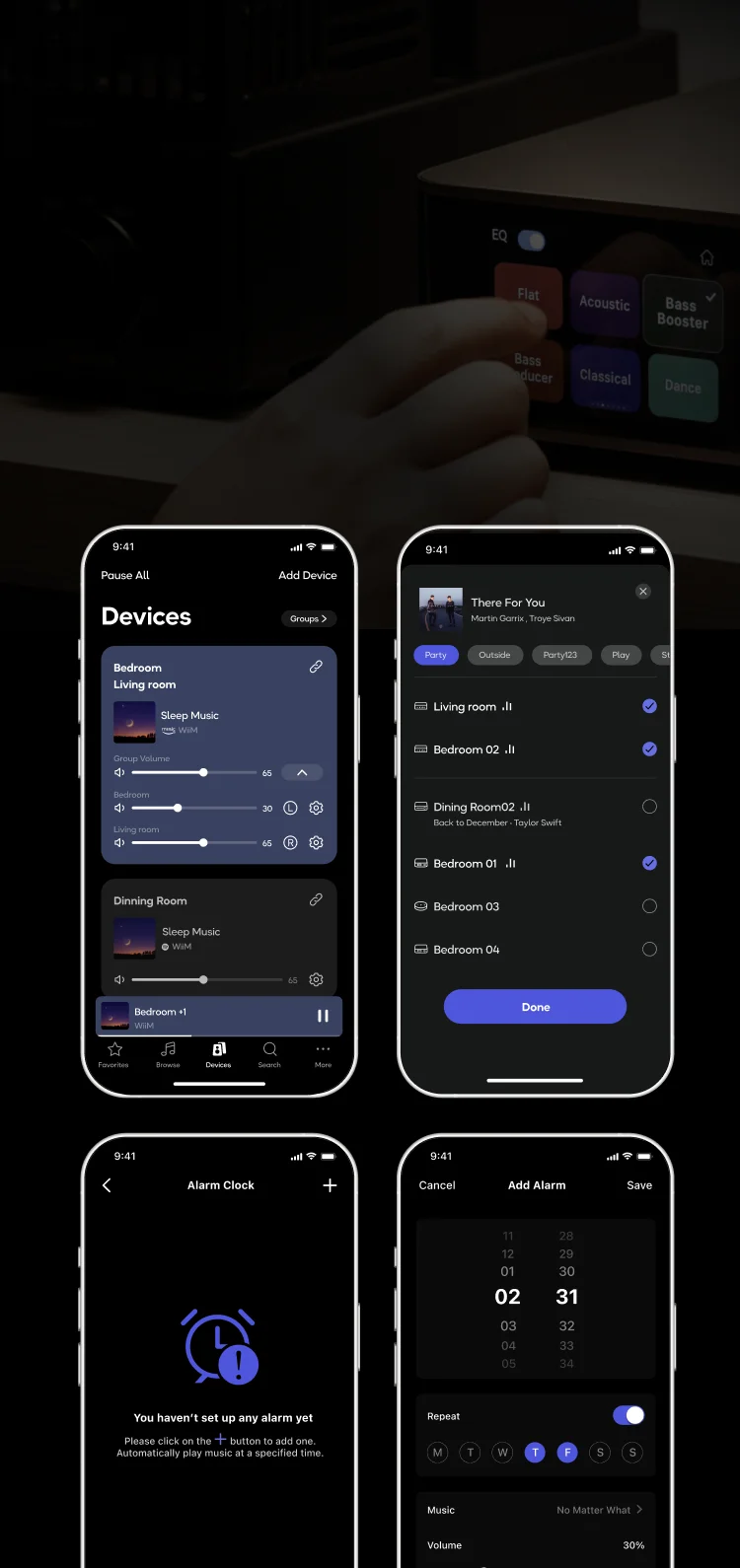 Stream music, adjust EQ, group rooms, set alarms, or update firmware with ease—right from your phone or tablet.